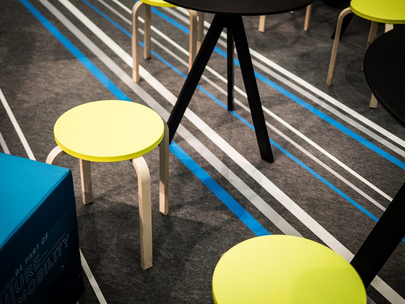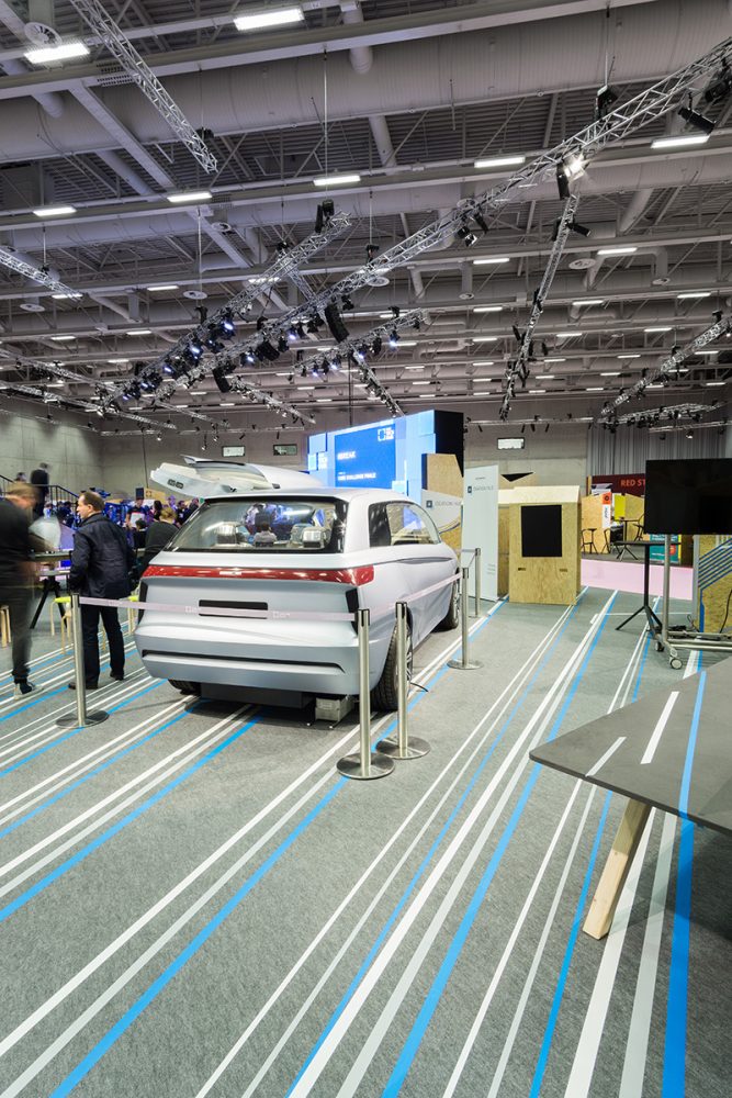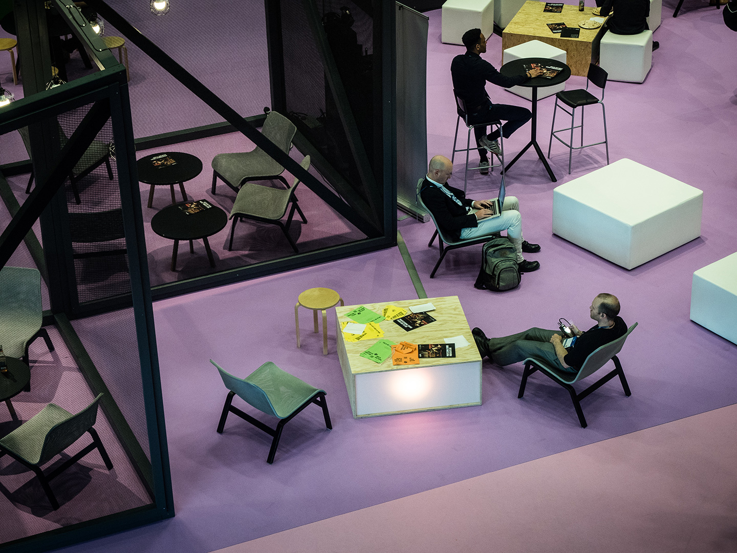 Ein Messe-Konzept ohne den typischen Messe-Charakter: keine geschlossenen Standboxen, kein Systembau, keine langen Gänge. Stattdessen: freies Bewegen, Mäandern zwischen Ausstellungen, Lounges und Pitch-Bühnen.